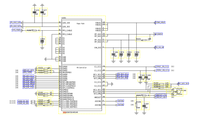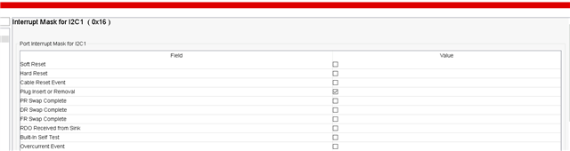 当前项目需要通过扩展坞充电。当扩展坞连接设备时会产生I2C中断(通过固件配置,如图一示),当检测到设备电源作为source时,我们会在中断函数中拉高gpio114,此时TPS65987D有5v的vcharge输入,有5v的vbus输出(如图二图三),从而设备向外输出5v为扩展坞供电,但是此时再将适配器插入扩展坞c口想为设备供电时,无法响应I2C中断,但是我们需要在中断函数中将gpio114拉低。请问如何解决这个问题?
