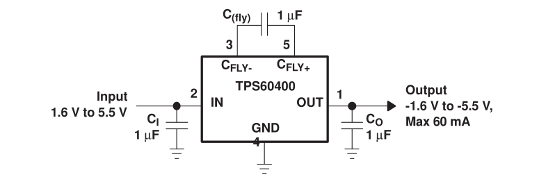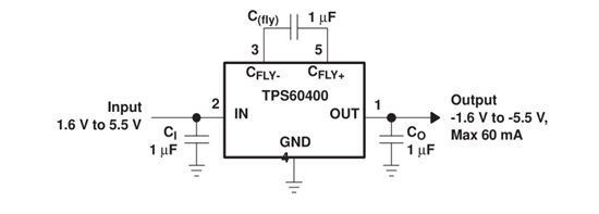 TPS60401系列器件产生的输入电压范围为1.6 V至5.5 V.该设备通常由5 V或3.3 V的预调节电源轨提供一个不受管制的负输出电压,由于其宽输入电压范围,两个或三个镍镉,镍氢电池,或碱性电池,以及1节锂离子电池还可以驱动它们。