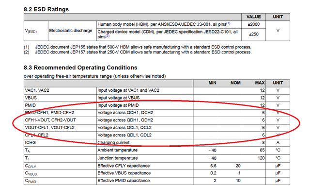 我在测试BQ25960EVK 的时候发现PMID-CFH1的耐压只有7V , VBUS-PMID 的耐压是12V ,请帮我核实一下,芯片内部的耐压是多少,因为要根据