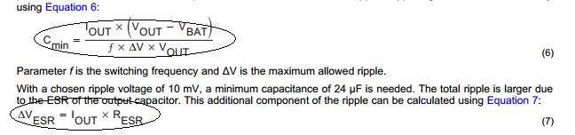 再就是输出电容的选择计算问题了,童谣需要考虑容量以及ESR的问题,可以参考下面的计算公式: