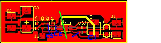 对于PCB的设计,TI FAE:Stone Zeng 的另外一个建议如下:目前的功率环路很大,请做如下更改,把C1移动到L1下方,C2,C3也靠近IC(如图中蓝线所示)