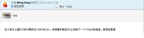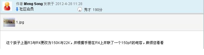 我们看看楼主相关的试验问题:这个扳子上面R3与R4更改为150K与22K,并根据手册在R4上并联了一个150pF的电容,麻烦您看看?