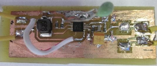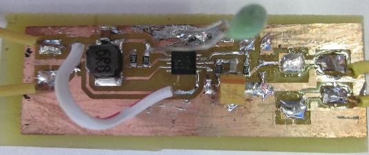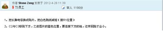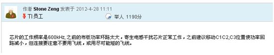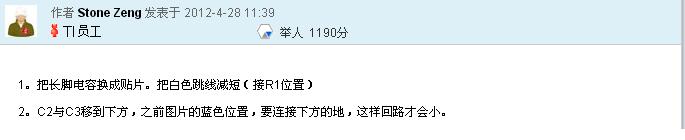 TI FAE: Stone Zeng解答了楼主的问题:1。把长脚电容换成贴片。把白色跳线减短(接R1位置)2。C2与C3移到下方,之前图片的蓝色位置,要连接下方的地,这样回路才会小。
