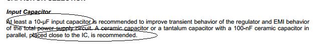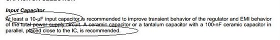 然后就是输入电容的选择问题了,如下图所示,10uF的陶瓷电容是必须的,而且需要尽量的靠近IC的PIN脚位置。