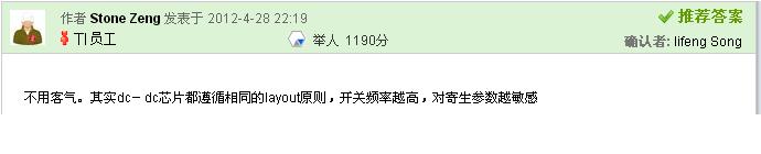 对于PCB的画板问题,TI技术人员提供的建议如下所示:其实dc-dc芯片都遵循相同的layout原则,开关频率越高,对寄生参数越敏感