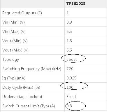 如上图所示,我们可以看到TPS61028的输入电压范围为0.9V到6.5V,输出电压范围为1.8V到5.5V。最大开关电流为0.8A,最大的占空比为100%,典型的控制拓扑结构为Boost,也就是说TPS54531主要是用了实现升压输出。这个对我们的设计就简单多了.
