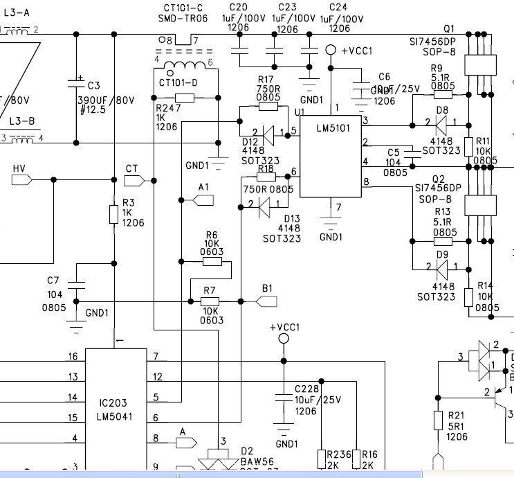 2、给LM5101外挂自举二极管,仍是无法工作,为防止芯片有问题,更换了一家供应商并且批号不相同,但故障仍相同。