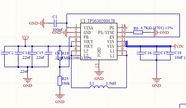 Could you please help me? Here is the schematic diagram. I want to upgrade 3V to 3.3V and use 3V button battery to supply power to TPS63020, but I don't know where there seems to be a problem in the booster circuit, resulting in only 2.1V output voltage. When I use 3.6V battery to supply power, it can be used normally. Could you please help me find out what is wrong with my circuit? Does the chip have requirements for input current?should I do?