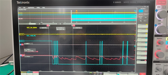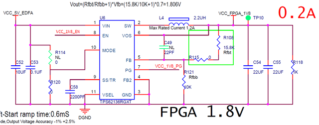 TPS62136, 输入5V,输出1.8V,实际电流大概0.2A, 最近在温箱55度,实际PCB温度大概70度的情况下,出现某一时刻开始输出电压降低且不稳定。同一PCB上我们还使用了这款芯片输出1V, 电路上仅2.2uH电感型号不一样,观察到1V很稳定。