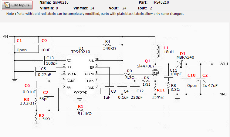 电路图见附件。用TPS40210芯片将输入电压8到12V的直流转变为24V直流输出,电感没有找到18uh的,用的是22Uh,0.27uf的电容用的是0.1uf代替,15毫欧姆的电阻没接,但三极管irf640发热严重,且被烧坏冒烟。请问如何解决?谢谢!!!另请说明图中C2值为2*47uf,请问这两个电容怎样连接?谢谢您的回复!