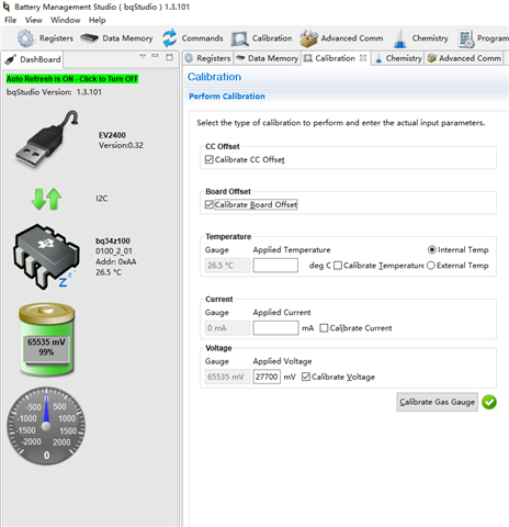 1.现在在进行校准后,BQ Studio显示的电压总是达到上限值65535,如下图所示,是什么原因?怎么校准 呢?设计的电池最高电压<35000mV,电流<20A,Volt Scale 和Current Scale都设定为1,是没有问题的吧?