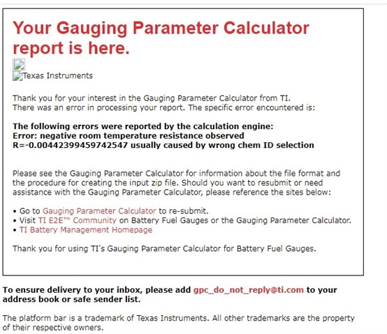 请教一下,用的BQ34Z100电量计IC,在做低温补偿数据时出现的问题,上传补偿数据后如下图TI回复问题,附件低温补偿需要上传的数据和chemical ID返回的数据ID,5377这个ID是官网返回来推荐的ID,这个问题我需要怎么进入下一步,谢谢. 相关文件请参考上传文档。