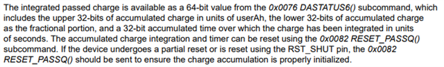 2、 BQ76952在哪种情况下会自动ResetPassQ?因为使用中发现充满电后搁置一段时间Accum Charge参数自动变0了。