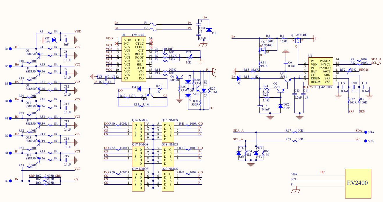 我详细的描述一下,首先保护IC(cw1274)的温度保护设置:充电保护 低温 0℃ ,高温45℃。放电保护 低温-20℃,高温70℃。根据上面所说,整个电路已经进入了低温充电保护状态,0.1~0.5A放电时,CO是低电平,DO是高电平,P-到B-相当于隔了一个二极管, 此时是可以通讯的,当电流到达0.8A~1.5A时,通讯突然中断,只有把电流调到0.1A~0.5A,或者1.6A以上,通讯才能恢复。保护IC(CW1274)的放电判断:CS检测电压>2.5mV.也就是说1.6A放电时(1.6*1.6667=2.6667mV),co输出高电平,P-到B-就不存在二极管了,通讯自然就恢复了