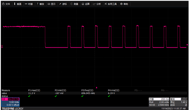 触发过充保护后MOS关断,并进行放电一段时间,再充电后达到3.55V COV保护值后切断MOS几秒又打开再切断,打开和切断的过程中没有触发到Recovery3.3V(磷酸铁锂电芯)。想请教一下可能是什么原因?我用示波器抓了BQ76930芯片的2引脚充电驱动电压,也是在11V和0V来回切换