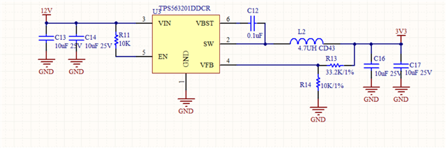 这个是12v 降压到 3.3v电路,实测暂时没发现问题,老师帮忙看一下是否需要完善。
