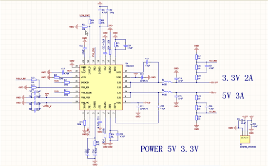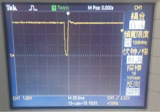 采用TPS65252供电,9V 输入,输出BLUK1 为5V 3A, BLUK2 为 3.3V 2A,但是测试发现,当3.3V电流超过400mA时,会出现大约10ms的断电脉冲(估计是过流保护),如下图:(同样5V也是在超过过600mA时,出现以下现象,这回标称的3A,2A差太远了吧???)