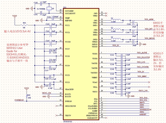 现在采用TPS659102这款芯片作为SAMSUNG S3C6410的电源管理芯片,原理图设计参考TI提供的TPS659102 User Guide for S3C6410手册,该手册提供的有LDO和SMPS的默认输出电压,但是现在VIO和VDIG1输出始终不正常,其他通道均正常。现在还在硬件调试,无法设置内部寄存器。芯片上电后各个通道应该有一个默认输出电压,麻烦告知。以下是我的原理图设计,请指出错误的地方,谢谢!