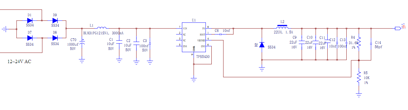当使用24V-AC交流电源供电时,老化几天或者几个小时会出现TPS5430烧坏短路。