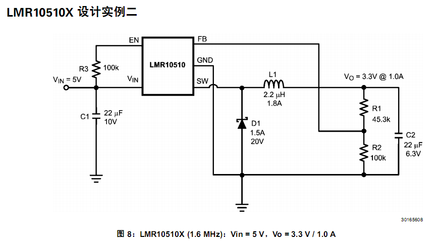 原理图如图所示,然后PCB布局是参照某开发板上的LMR10510布局,请问为何输出只有0.8V这么低?就没有3.3V呢?线路板上调试的时候只是单独把原理图部分焊接了器件来调节的。