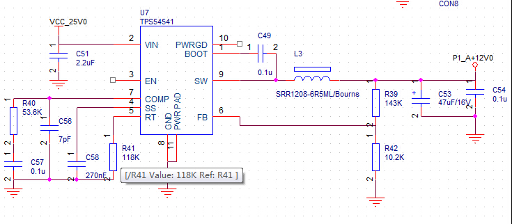 TPS54541里面只集成了一个high-side MOS, 原理图里面好像没有外部的二极管啊,你可以对比数据手册中的电路图。