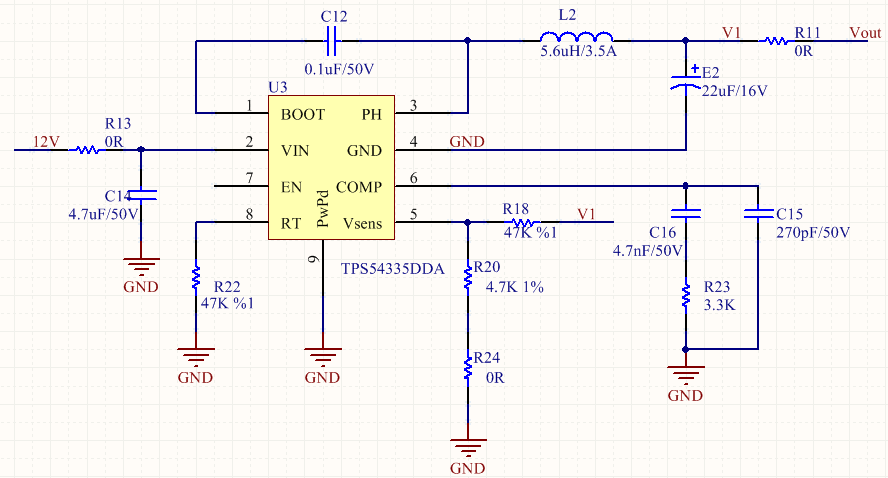 设计12V/3A输入,8.8V输出,使用TPS54334DDA,电路原理图如下: