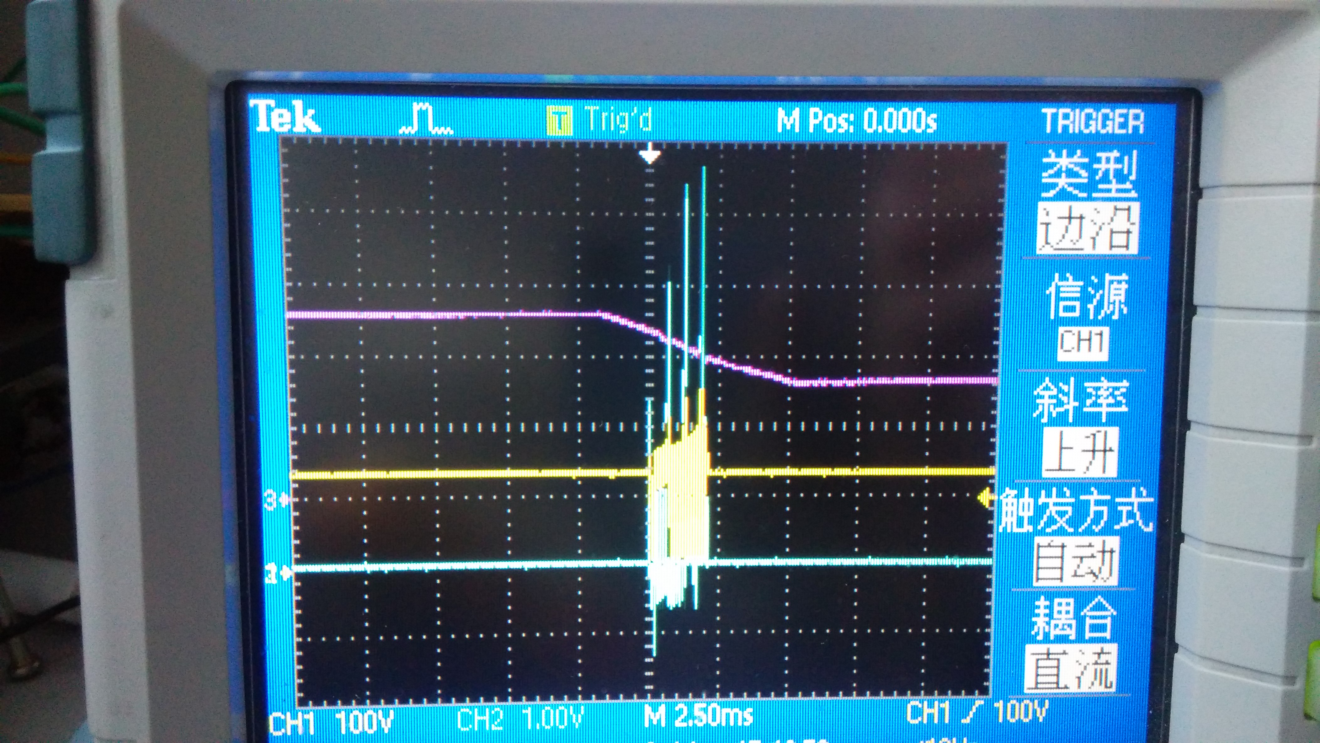 黄色是VDS的波形,每次启动都是震荡几下的,当电压在300V启动时,基本上DS开关一下就保护(SS拉低)了