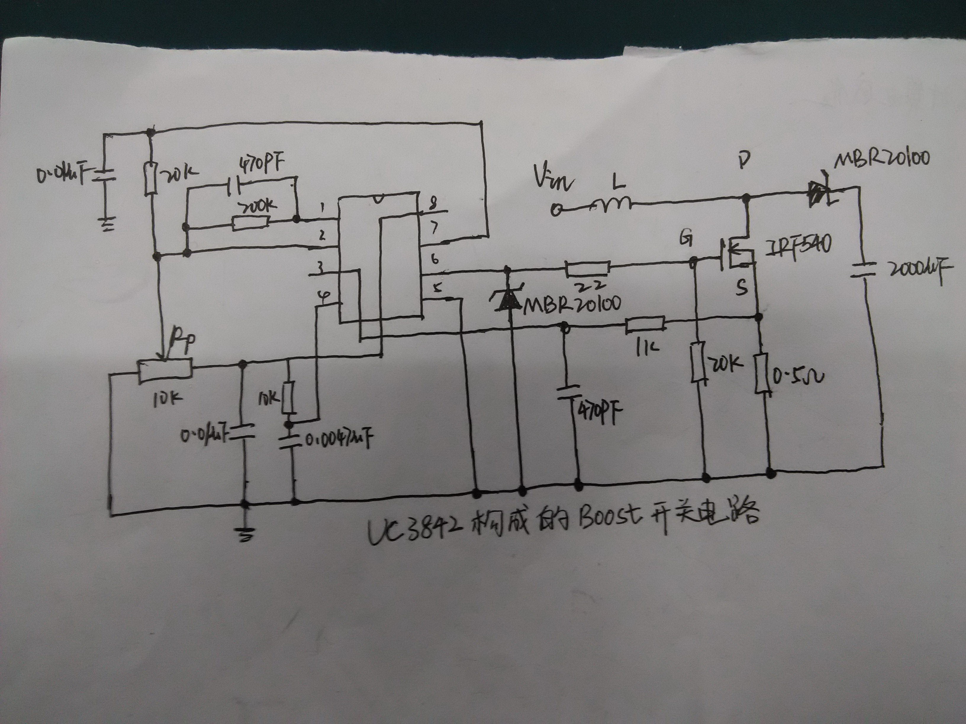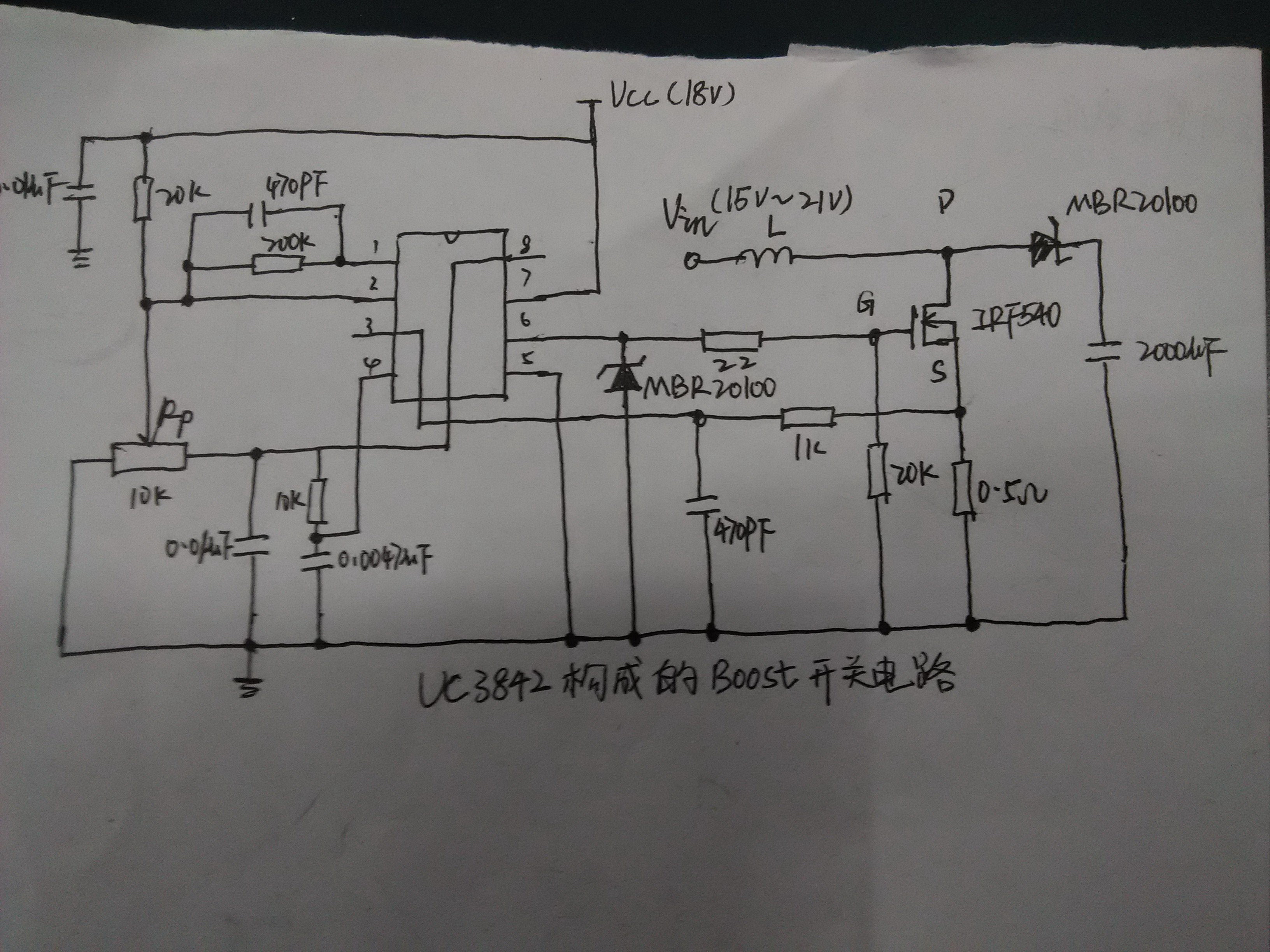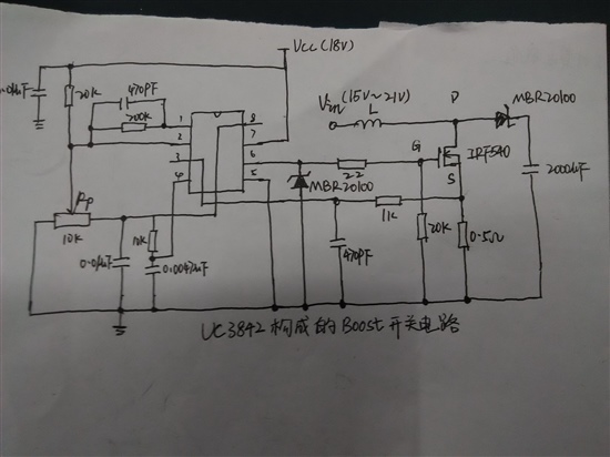 输入15V到21V,本来打算做30V到36V输出,但是输出调节到最大60V后,然后自己又自动下降,直至26v不变,MOS管irf540,3个脚的波形都一样,如下图,电路图也如下,请问是什么原因啊