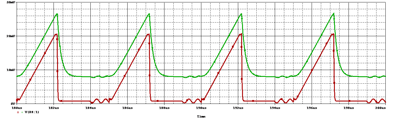 以190us时刻分析,此时电流采样增量分别为0.8mV和8mV,但190.5us至最大电流时刻两波形只存在平行上移关系,即没有斜坡度增加的效果。