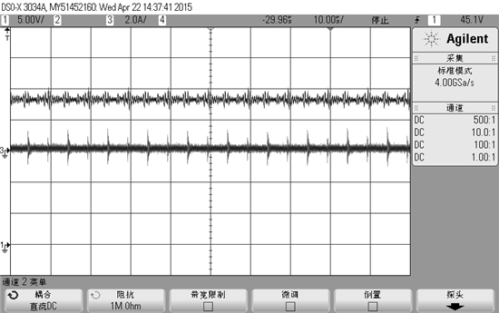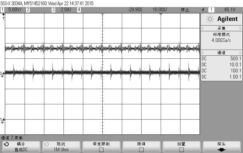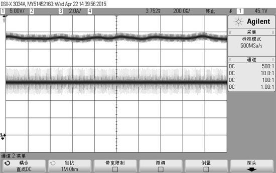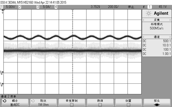 波形如上图,上下两个波形分别为电流和电压波形。输出电压14V,输出电流在小于15A的时候出现不平稳状况,电压波形也纹波增大。当输出电流大于15A时就正常了。请问:应该如何解决???  是基于dsp数字控制的。
