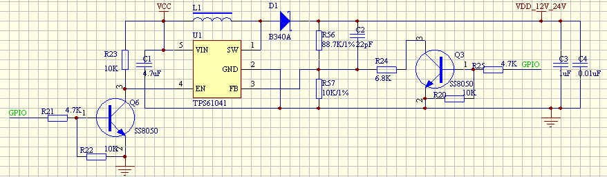 考虑使用一个TPS61041来控制输出两路电源,同一时间只有一路工作,电路如图,根据修改后的电路推导出输出电压公式为VOUT=(1+R56/R57+R56/24)*1.233-R56/R24*Vce,图中三极管截止时输出12V,打开后大致输出24V,想请教这样操作是否有问题,谢谢了。