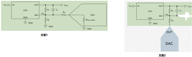我想用DAC来实现LDO输出电压的调整,VOUT电压会一直高于FB引脚电压,目前有两种方案,方案2计算VOUT的公式会简单些,不太清楚哪种方案会更好,可否帮忙指点下