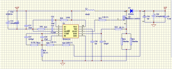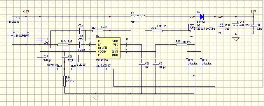 我在用TPS40210做的DC-DC ,输入 DC 15V,OUTPUT 33V,下面是其电路图,测试在空载时可以满足输出33V,但是在呆载10OHM,电压就掉到2V左右,