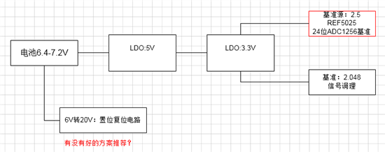 2:5V经LDO转3.3 为STM32单片机,3.3经REF5025得2.5V(ADS1256的基准),3.3转2.048为信号调理基准(约0.05%精确度)