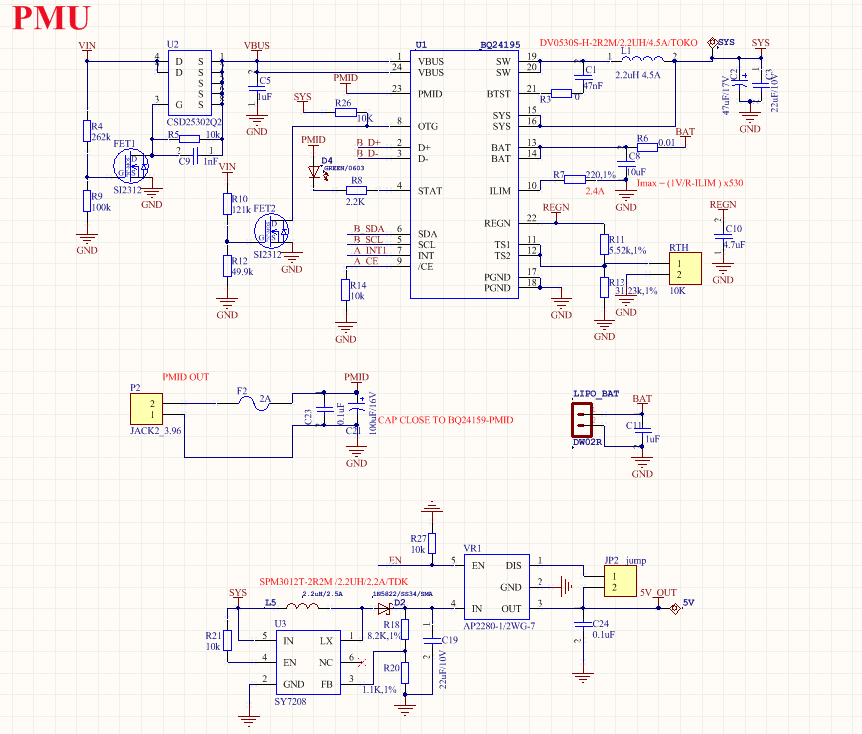 1.一路5V电源A输出由BQ24159的SYS通过升压方式输出,当这路电源A无负载时升压芯片输出为5V,SYS为3.67V;当负载达到500mA电流时,SYS输出为3.46V,升压芯片输出为4.97V;当负载达到1A电流时,SYS输出为3.13V,升压芯片输出为4.68V,此时电池电压为3.31V;按照说明SYS可以输出4.5A电流,但是这里超过500mA就不行了?