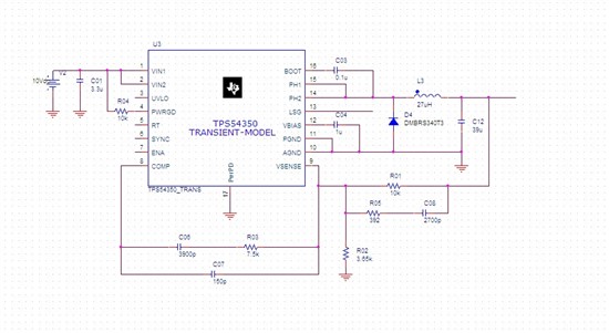 谁能帮帮我!!我在仿真TPS54350基本电路的时候,仿真结果中的输出电压特别小,只有几mV不知道哪儿出了问题。想请教一下大家。十分感谢!!附上电路图。