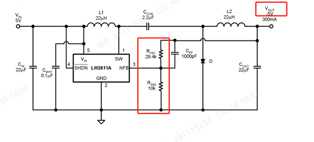 我在LM2611的datasheet里面没有找到有关输出电压的计算公式,根据一般DCDC的规律,我认为Vout=(1+Rf1/Rf2)*Vfb