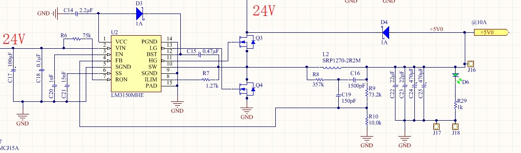 电路图和PCB板如下图。电感按设计是2.2uH,但是买的元件还没回来,先用这个代替(之前也留了足够的位置)。