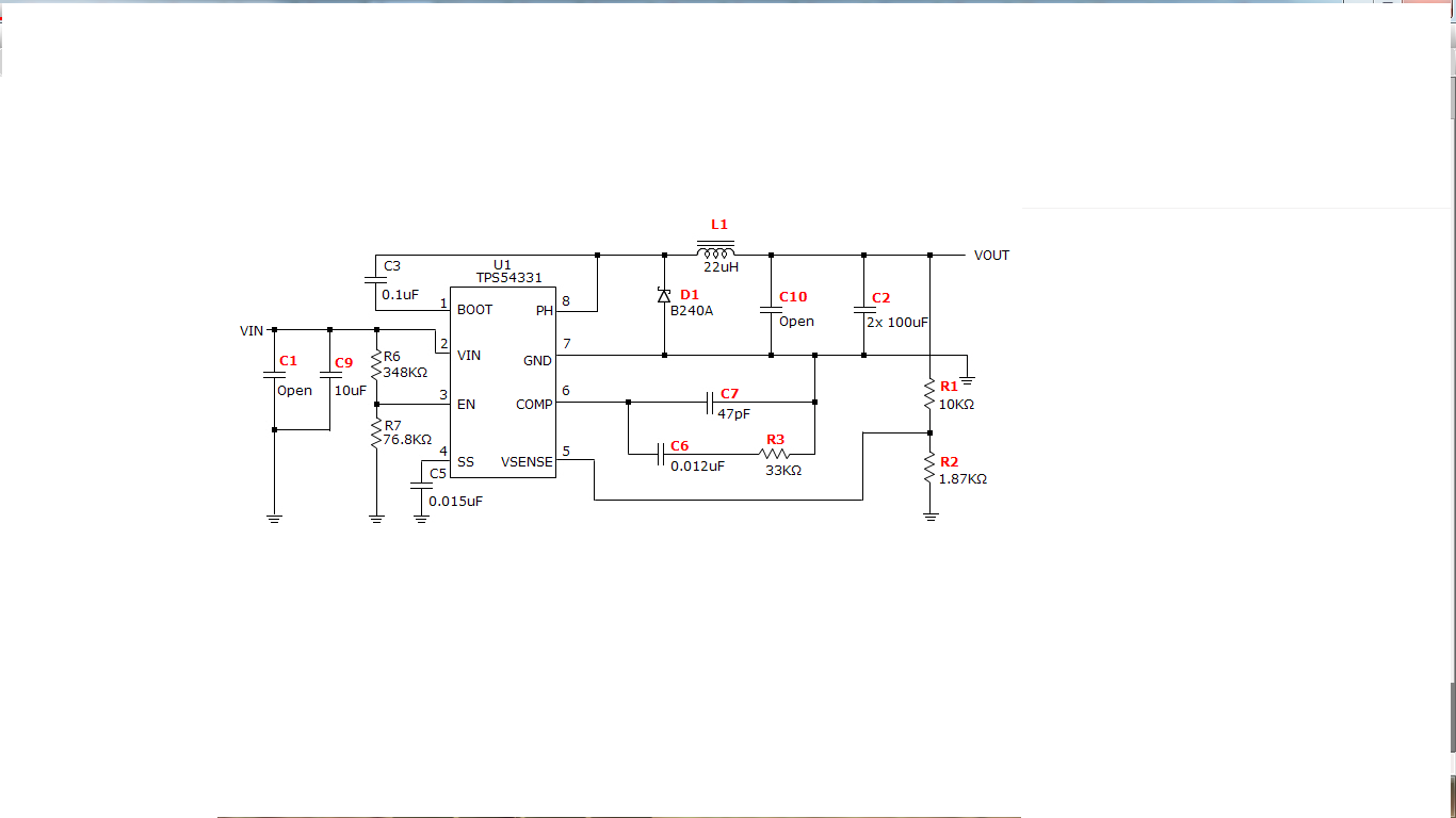 请问图中的C1 Open指什么?没有接是吧?TPS54331在输入端如果没有接去藕电容极易产生自激。表现出来的就如你所说的现象。
