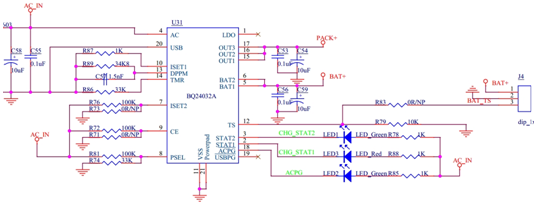 我司目前使用的充电及路径管理芯片BQ24032A的原理图,目前遇到的问题:BAT+初次接电池时,PACK+输出仅为2.2V左右,必须再插拔一次PACK+才能正常输出电池电压,麻烦帮忙看一下是否是电路有问题?