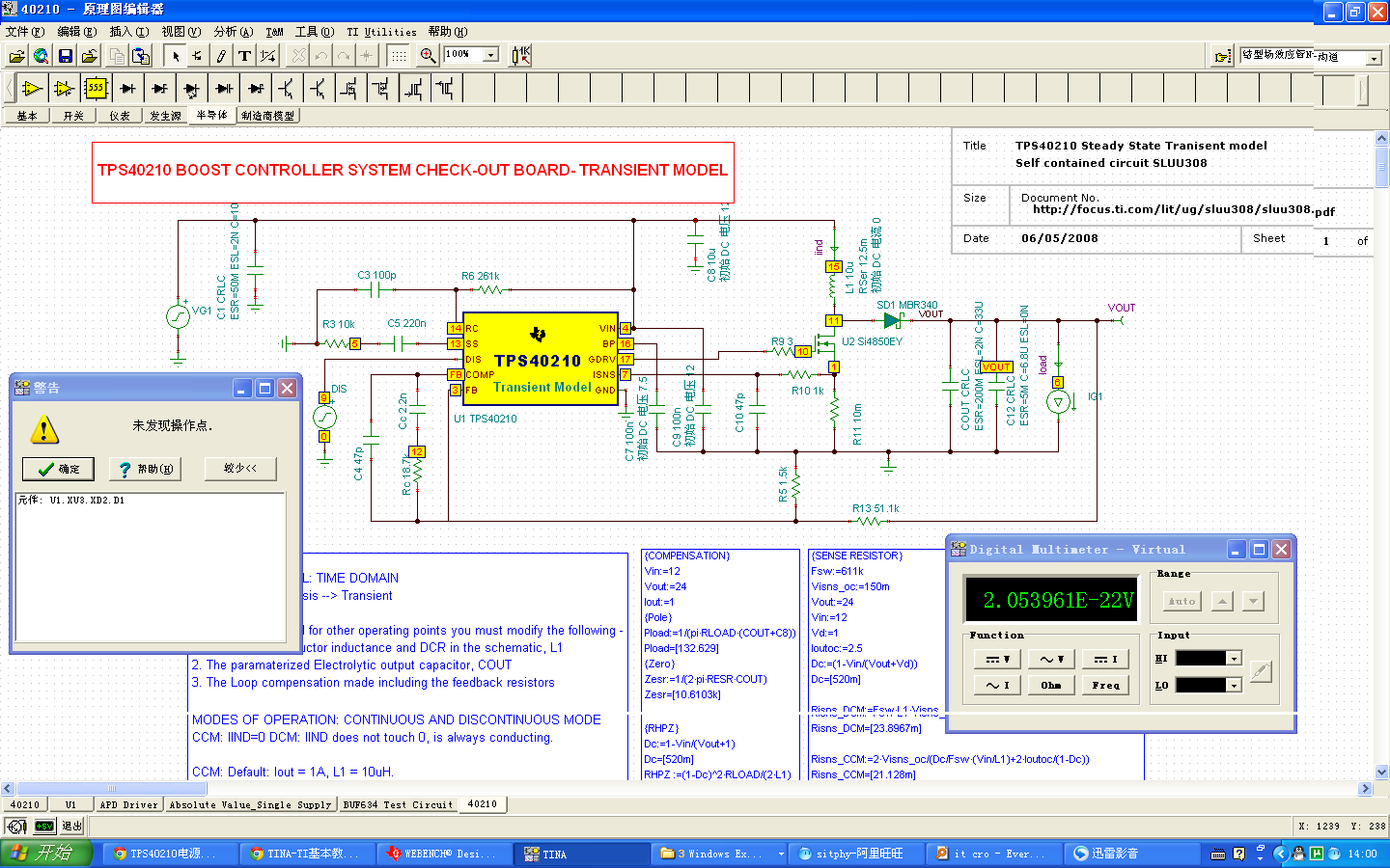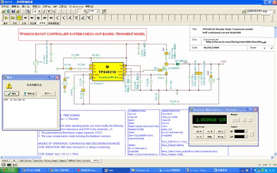 从此论坛下载的“40210.tsc”,打开后将输入电压VG1赋值12V,其余未改。打开万用表,点击直流电压,然后弹出提示,未发现操作点,见图。
