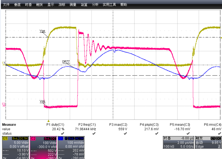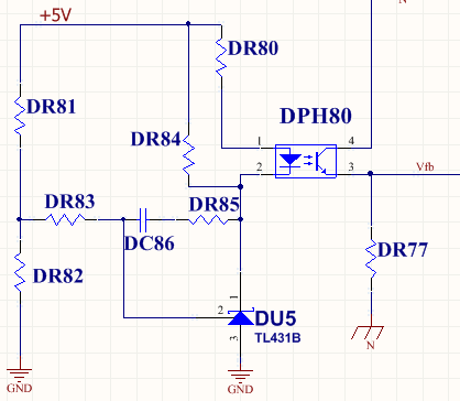 下图中通道3为上图中DR77(Vfb,UC2844第2pin)处电压AC输入波形,想问一下一前一后两个波峰分别对应了电源的什么动作状态,并且这个波形是否可以说明作为反馈的光耦是工作在线性状态?如果只通过调整反馈电阻DR81,DR82使输出电压从5V变为5.2V,会间接带来哪些后果,请指教,谢谢。。。