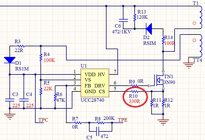 如上图是我设计的三相输入,输出15V/0.5A的电源的部分截图,测试时候我发现一个问题,就是慢慢从0V加电压到650V的话,输出电压正常带载正常。但是直接一下子加650V高压进来,输出电压为0,芯片不停的从启;我将红笔圈出的电阻由原来的510R改为330R上面的问题就解决了。
