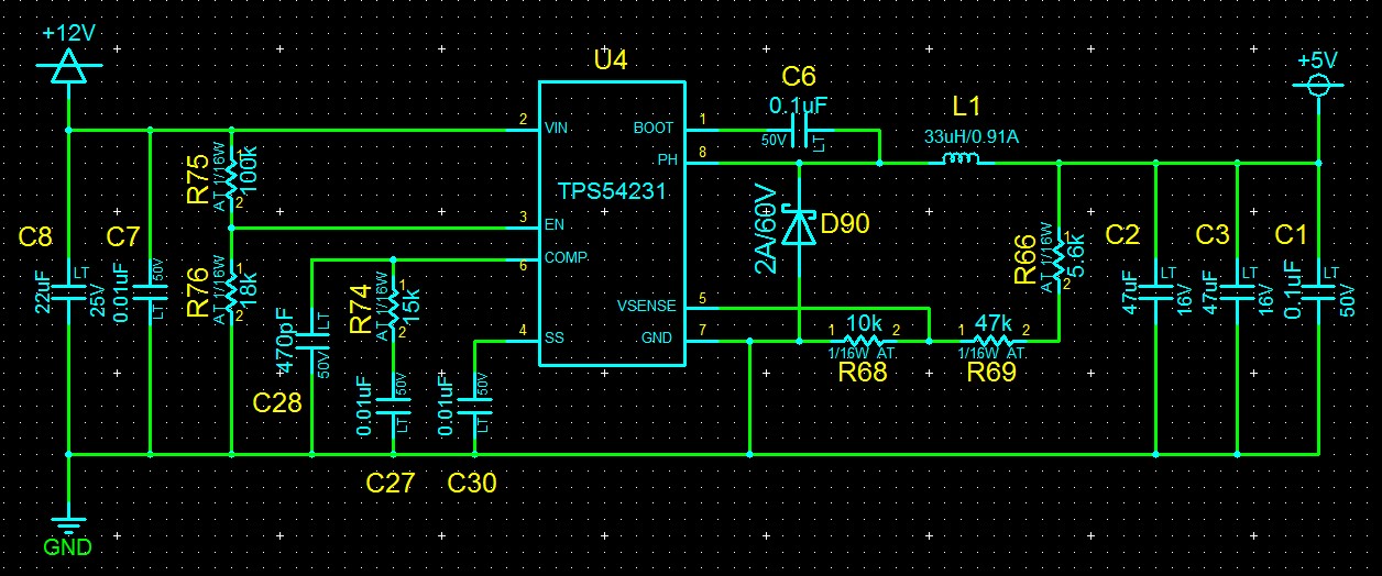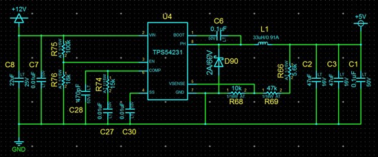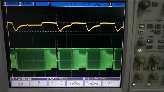 由于应用原因,负载突变频繁,当从50mA变为400mA时,输出电压从5V突降到4.3V左右,导致印板复位,分析是由于TPS54231进入Eco-mode后输出来不及响应。当负载150mA突变至600mA时,则没有这个问题。