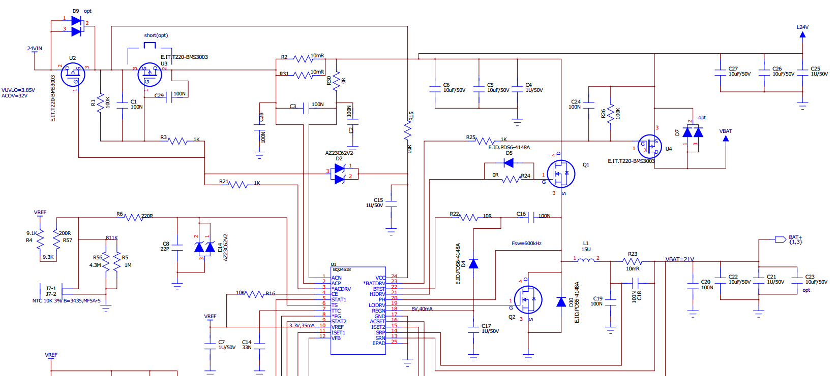 所以,结论是电池通过充电的上臂给L24V供电了。我的疑问是:在sleep状态,VBTST是不是应当为0V? 因为我要求在电池供电时,系统能切断电池供电,我现在的方案是在BAT+和BQ24617的BAT PMOS之间又串了一个PMOS。你们有没有建议?