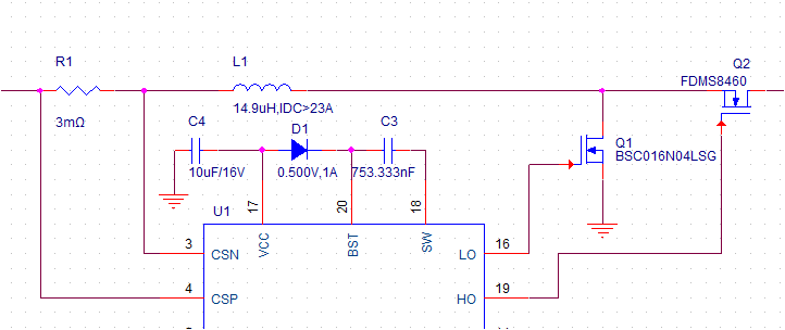1. 功率电感的选择(L1),如附件图中所示,需要电感感值大于15uH,饱和电流大于23A。