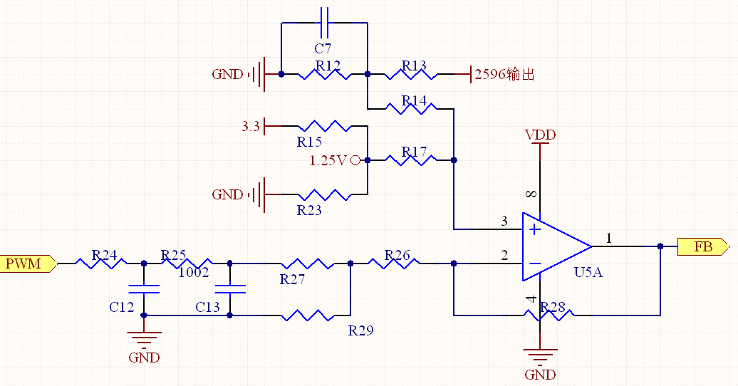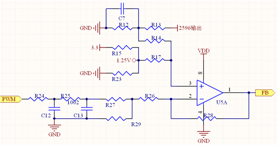 最近在用2596做数控电压源,原理是单片机输出PWM经一阶滤波后与2596输出的分压接入运放,组成减法器,运放输出接到2596的FB端。简图如下