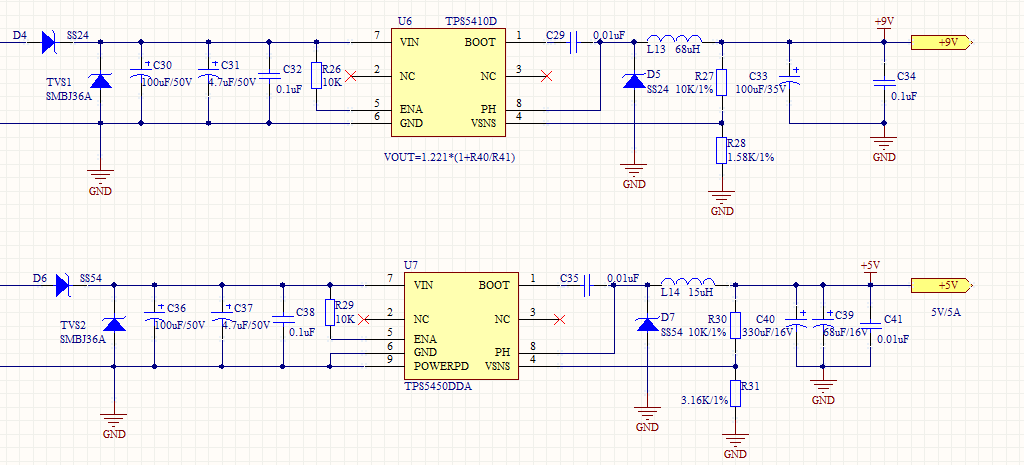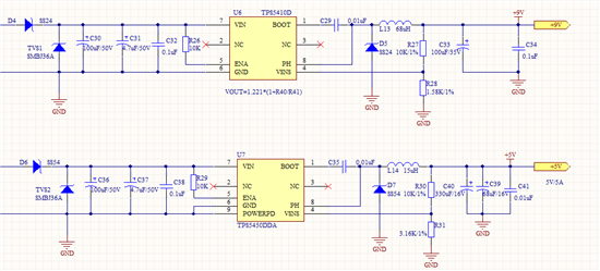 您好 我在使用TPS5450和TPS5410的时候遇到一个很奇怪的问题 :当我接好电源线再打开稳压电源的使用使用正常,但当我先打开稳压电源,在将接线端子插上时,就没有输出 输出只有0.64V,下面是我的电路,我猜想是不是我的输入电容小了,但看手册也不存在这样的问题,请专家帮我分析下,在线等待。谢谢