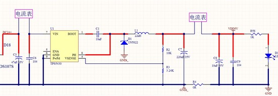 大家好,我现在在做一个产品,24V转5V然后给后级负载供电,用的TPS5430,输入端测试数据:26.35V 22.6mA,输出端数据:5V 65.5mA,效率只有54.9%。测试点及电路图参考附件,能不能