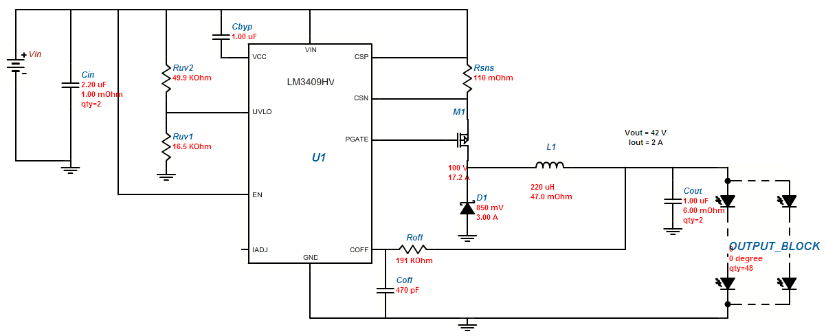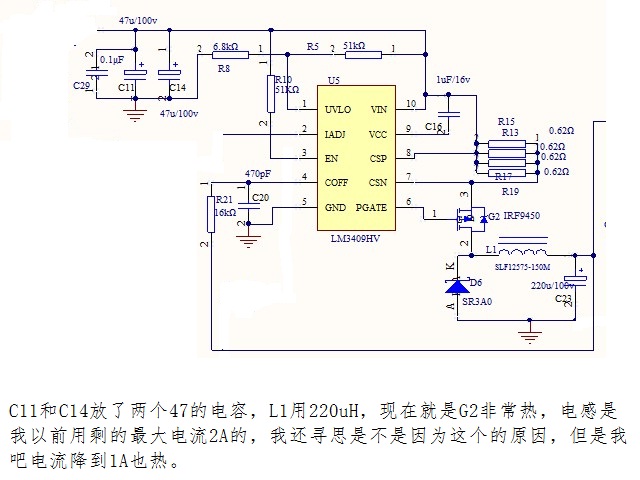 我准备使用LM3409HV作一个开关恒流源,为充电器充电,前级整流之后的电压大概是60V左右,偶尔会在48~70之间波动,电池为32节镍氢电池,充电电流快充2A,涓流500mA,我根据设计指南设计了一个电路,今天搭了一下,PMOS非常的热,说明我搭的电路效率不高,不知道LM3409HV的效率跟那个参数有关,32节电池从放空到冲饱电压范围是32V~45V,也就是说输出电压会在32V~45V间波动,而参考设计上的输出电压假定是恒定的,是不是因为当输出电压变化后电路效率变低而使得PMOS发热。以前我问过别人利用LM3409HV可否作为充电电路,有人说行,但是现在来看还是有问题,那个大侠给帮个忙呀,现在样板都做出来了,项目时间很紧,着急呀